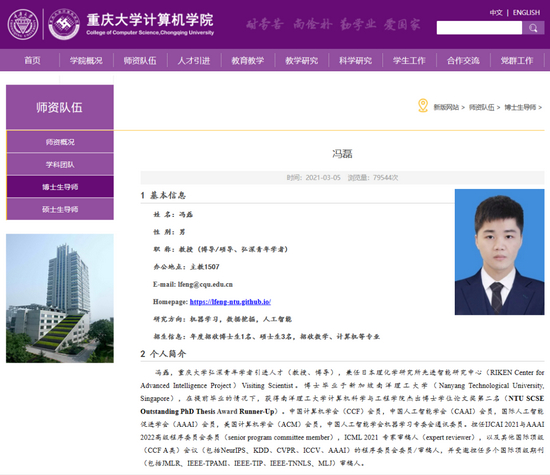 据悉,冯磊自2021年1月起加入计算机学院工作至今,算起来入职时实足年龄仅25岁零9个月,这是重庆大学计算机学院目前年龄最小的引进人才,也是学院有史以来首次直接给应届博士毕业生正高/博导岗位。