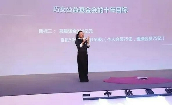 2016年12月,在第15届中国企业领袖年会上,何巧女表态,“希望巧女公益基金会在10年内募集200亿元”。