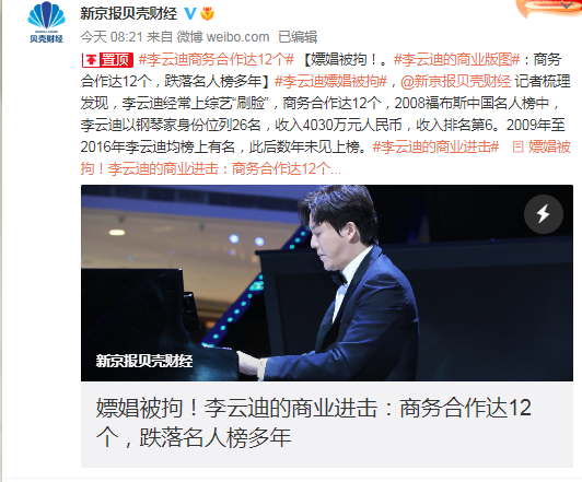 原标题:嫖娼被拘!李云迪的商业进击:商务合作达12个,跌落名人榜多年