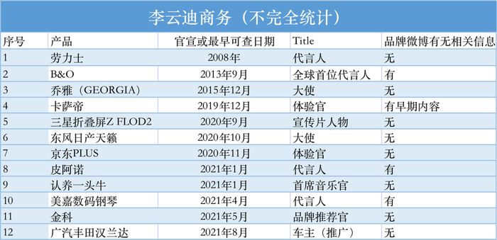 贝壳财经记者梳理相关商业品牌看到,李云迪的商业价值似乎并没有趁着这一节目的热度明显提高。可查询到的公开内容显示,李云迪商务合作(不完全统计)有12个,但是高端品牌劳力士、B&O均签约于2015年以前。