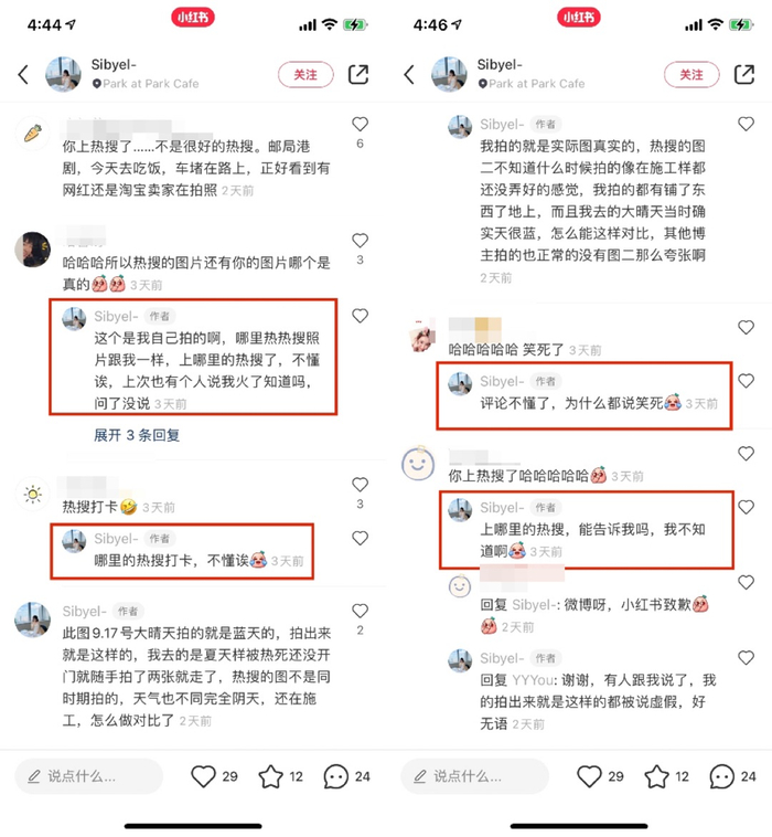 几天前,当她像往常一样打开自己的小红书,准备看看杭州本地推荐,但她突然发现,一条自己9月17日写的咖啡馆打卡的笔记骤然出现了不少新评论。“你上热搜了”“热搜打卡”“所以热搜上的照片和你的照片哪个是真的?”。。。。。。。