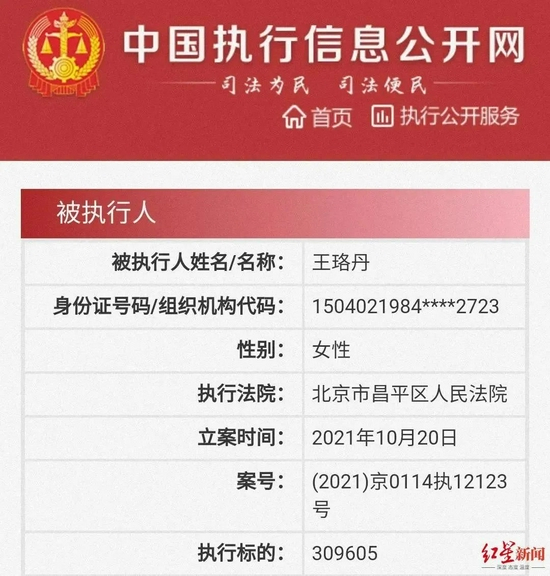不过,红星新闻记者在中国执行信息公开网搜索发现,王珞丹已经被列为被执行人,执行标的309605元,立案时间为10月20日。