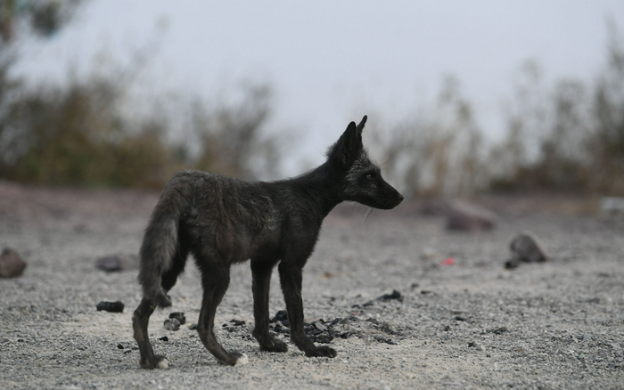 10月25日下午3点左右,记者在北京妙峰山禅涧路公路一侧的一条碎石土路上,发现了几只黑色狐狸,其中一只体型相对较大,皮毛几乎全黑,面部和尾巴带有白色的毛,另外两只体型较小的狐狸跟着前者在附近游走,较为瘦小,毛色几乎全黑。