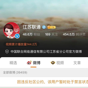 近日,有网友发现,江苏联通官方微博被禁言,具体原因不详,仅显示“违反社区公约”。