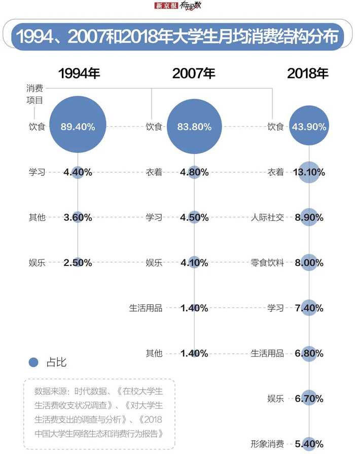 可以看出,在1994-2007年间,大学生每个月饮食消费支出仅由89.4%下滑至83.8%,但截至2018年,饮食虽然仍旧是占比最大的消费支出,但已仅占43.9%,大学生们将其余生活费用在了结构更为丰富的消费中。