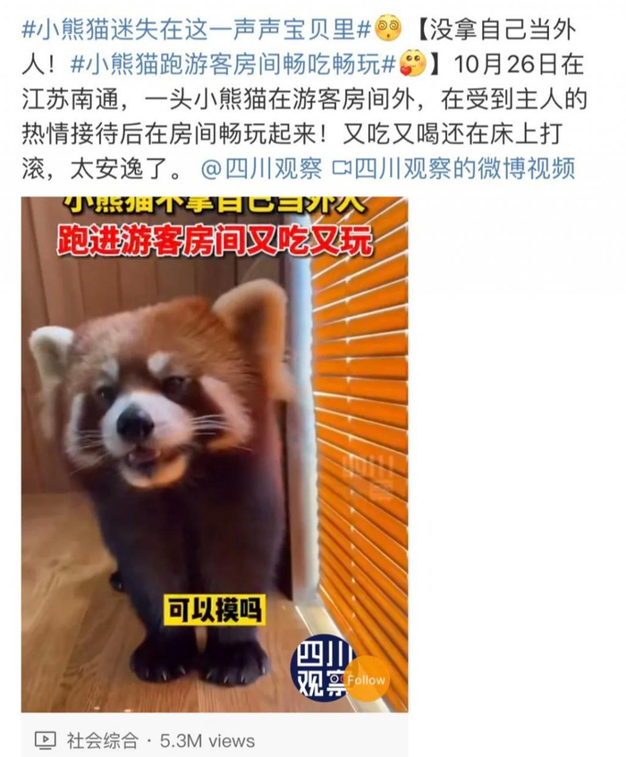 据了解,这是10月26日发生在江苏南通的事,不少媒体都带上#小熊猫迷失在这一声声宝贝里#、#小熊猫跑游客房间畅吃畅玩#的话题进行转发。这事也引起了不少网友的讨论,大家直呼可爱,称自己也想和小熊猫近距离接触,“rua”一“rua”小熊猫。