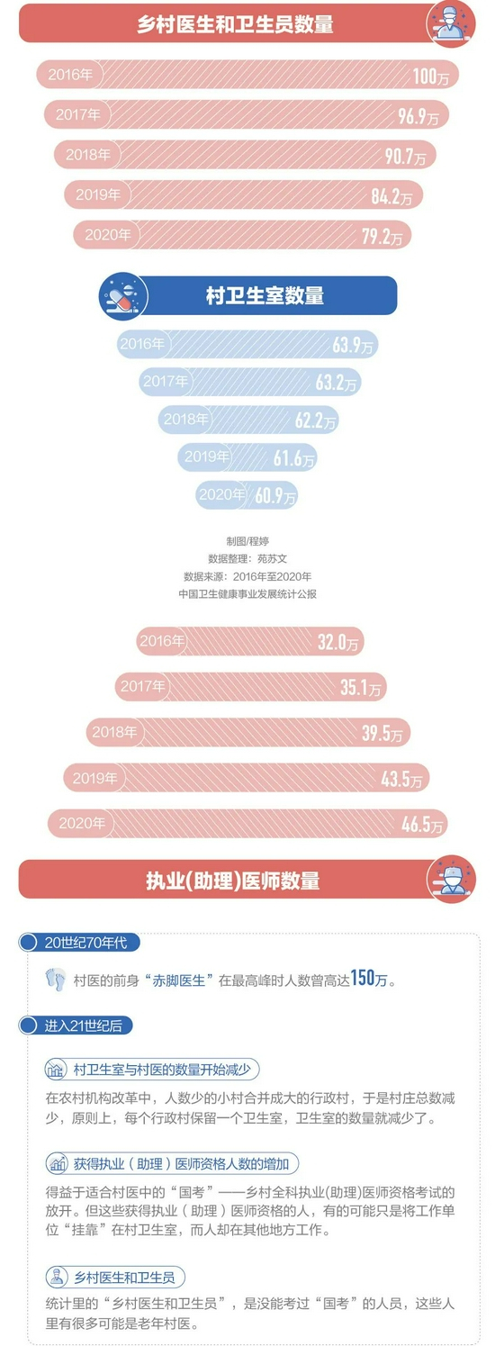 长期跟基层打交道的徐毓才解释说,在农村机构改革中,人数少的小村合并成大的行政村,于是村庄总数减少,原则上,每个行政村保留一个卫生室,卫生室也就减少了。而获得执业(助理)医师资格人数增加,得益于适合村医中的“国考”——乡村全科执业助理医师资格考试的放开。