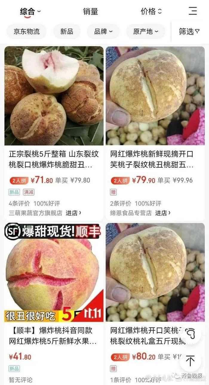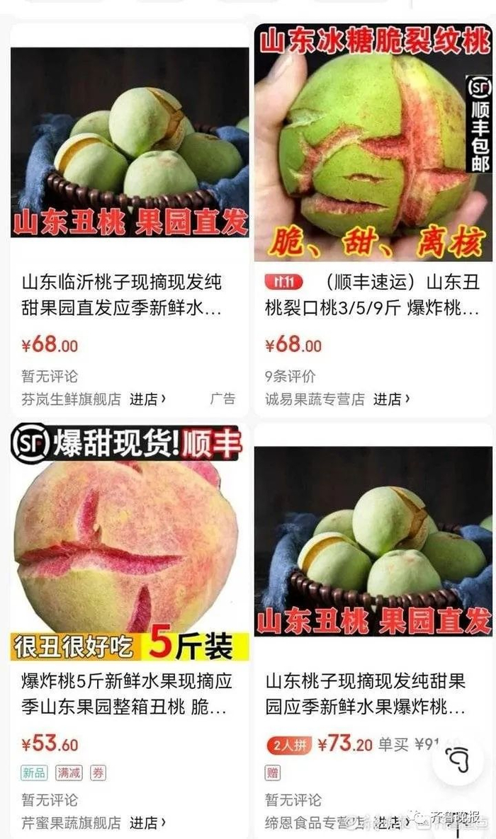 记者在某网络平台上输入“爆炸桃”,满屏都是这类裂着口子、号称“山东果园直发”的桃子。价格也相差很大,一种号称和短视频平台同款的价格相对较低,但一斤的价格也超过11元。