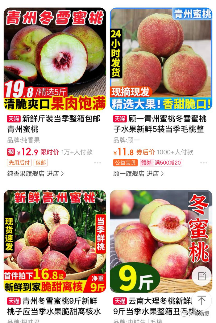 网购平台上,品相完好的冬雪蜜桃,5斤的售价在19.8元左右↓
