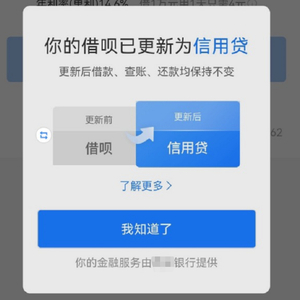 11月8日,有媒体报道称,支付宝“借呗”名称已经变更为“信用贷”,且明确提示由银行提供服务。