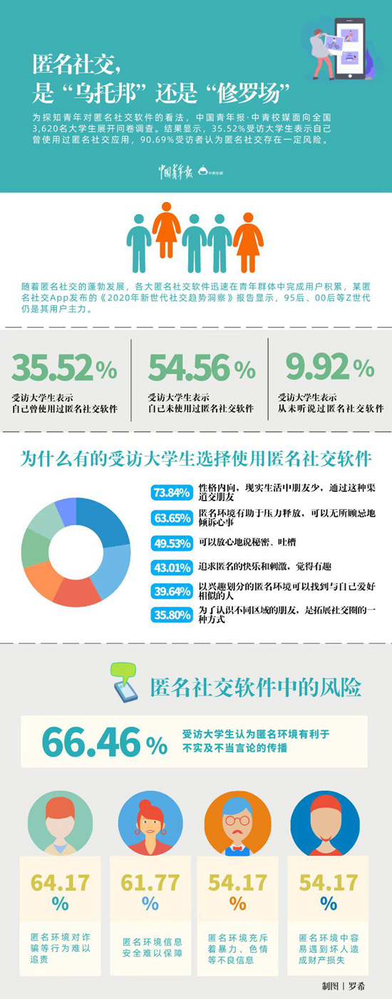 随着匿名社交的蓬勃发展,各大匿名社交软件迅速完成用户积累,某匿名社交App所属公司发布的《2020年新世代社交趋势洞察》报告中透露,95后、00后等是其用户主力。为探知青年对匿名社交软件的看法,中国青年报·中青校媒面向全国大学生展开问卷调查,共回收来自175所高校的3620份有效问卷。调查显示,35.52%受访大学生表示自己曾使用过匿名社交应用,90.69%受访者认为匿名社交存在一定风险。