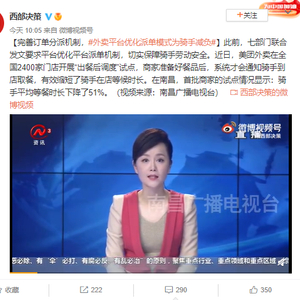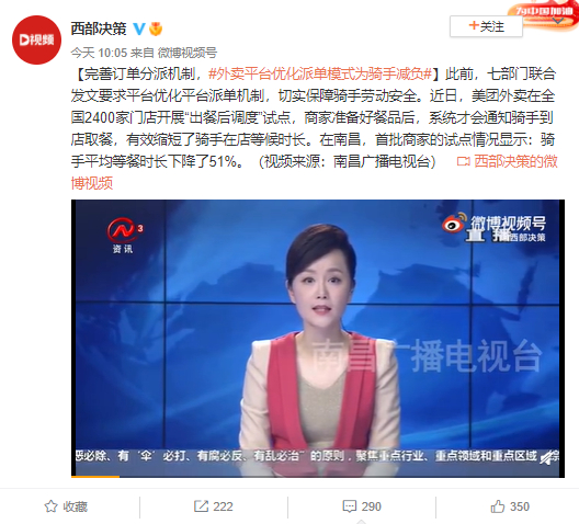 此前,七部门联合发文要求平台优化平台派单机制,切实保障骑手劳动安全。近日,美团外卖在全国2400家门店开展“出餐后调度”试点,商家准备好餐品后,系统才会通知骑手到店取餐,有效缩短了骑手在店等候时长。在南昌,首批商家的试点情况显示:骑手平均等餐时长下降了51%。(视频来源:南昌广播电视台)
