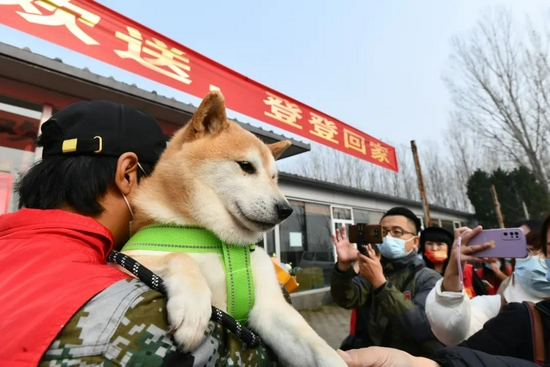 ·登登被新主人接回家当天,很多人赶来欢送。(北京市朝阳区人民法院曹璐 摄)