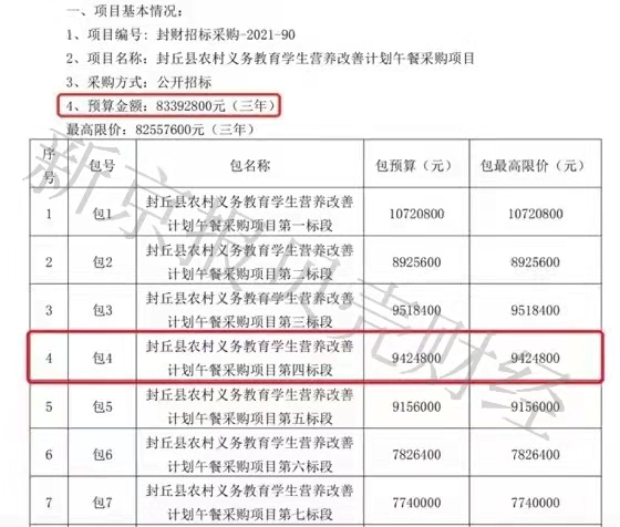 贝壳财经记者查阅看到,今年7月,封丘县农村义务教育学生营养改善计划午餐采购项目发布招标公告,其中预算金额三年为83392800元。