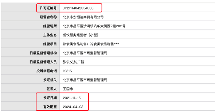 贝壳财经记者注意到,这一项目对特定资格有要求,包括投标人须具有独立法人资格,具有有效的营业执照;投标人须具有有效的食品经营许可证(主体业态为餐饮服务经营者)。记者在北京市市场监督管理局官网查询看到,北京志宏恒达商贸有限公司经营项目为热食类食品制售;冷食类食品制售,发证日期为2021年11月15日。