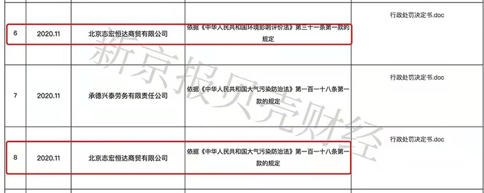 此外,贝壳财经记者在北京市昌平区政府2020年11月行政处罚信息中查询发现,北京志宏恒达商贸有限公司因违反相关环保规定被行政处罚两次。