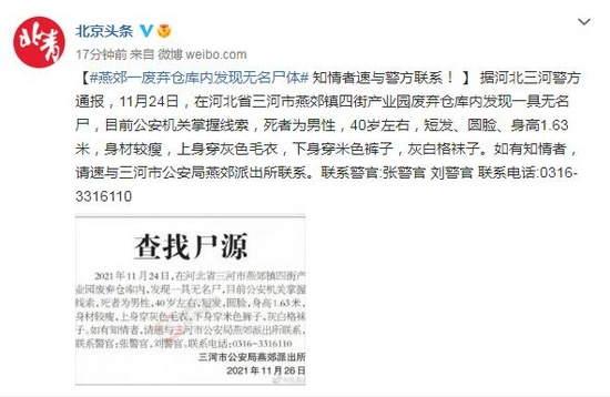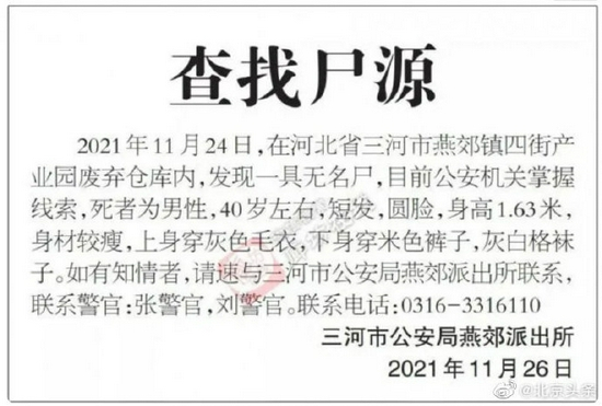 河北燕郊一废弃仓库内发现无名尸体 知情者速与警方联系!