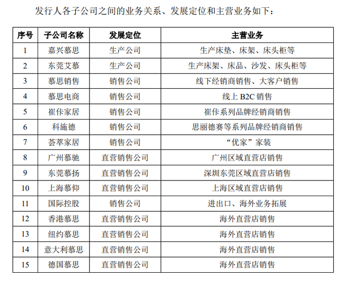 1。截至2021年9月30日,慕思股份拥有15家全资控股子公司和104家分公司,无参股公司。它控股的海外子公司,一家比一家年轻:德国慕思(注册于2014年)、意大利慕思(2015年)、纽约慕思(2017年)。简单来说:慕思股份的大本营在东莞、基本盘在国内,且国外分公司只承担直营销售业务。