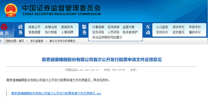 10月29日,证监会公开《慕思健康睡眠股份有限公司首次公开发行股票申请文件反馈意见》(下文简称“反馈意见”),共问询58个问题,其中包括营收、利润增速双降、广告费用高企、收入来源及经销模式极为单一等隐患。
