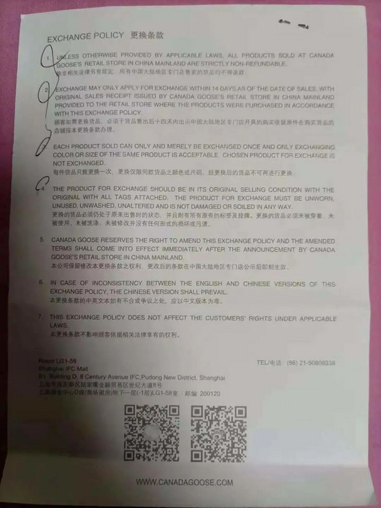 而后,《新京报》贝壳财经致电“加拿大鹅”在北京三里屯店和重庆IFS快闪店中国的其他门店,门店工作人员表示,所有中国大陆地区专门店售卖的货品均不得退货是中国区通用的条款,正常实体店铺出售货品不能退,因为顾客是看到实物购买的。