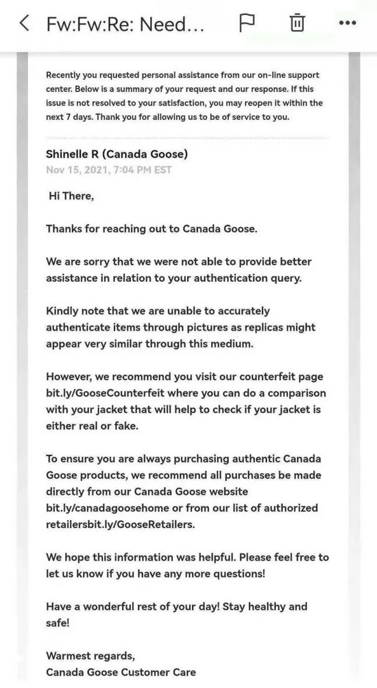 但当时的贾女士对此并不知情。她还天真地希望通过“加拿大鹅”公司来退货。11月14日,贾女士通过电子邮件,将衣服细节照片等发到了“加拿大鹅”的检测中心邮箱(ce@canadagoose.com)。但总公司的回信依然不能解决贾女士的问题。