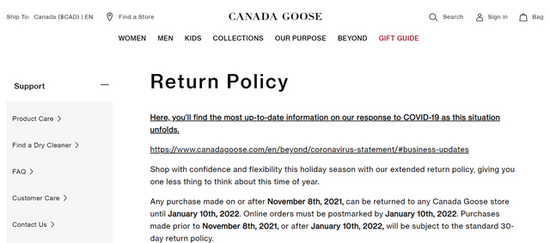 有意思的是,如果搜索“加拿大鹅”官方网站就不难发现,其在加拿大、美国、英国地区均有30天退货政策。