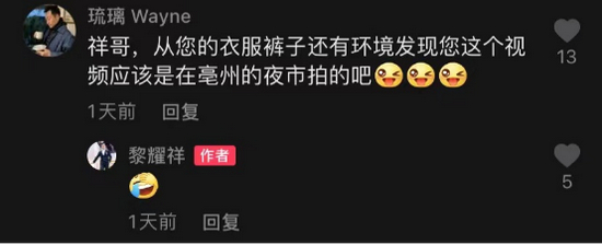 有内地网友在黎耀祥的这条小视频下留言问他是不是在亳州夜市拍的,黎耀祥当时回复了一个捂脸表情包。↓