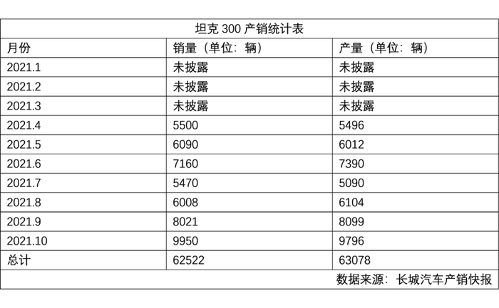 与此同时,中信证券在研报中指出:“预计随着重庆工厂产能改造,2021年底坦克300月产能将逐步爬坡至1.5万辆/月。”而截至发稿,2021年仅剩2个月的产能尚不明朗,皆以前述中信证券的数据预估,则总计还有30000辆坦克300待产。再结合前述长城汽车公布的前十个月63078辆的数据,则全年实际产量在93000辆左右。