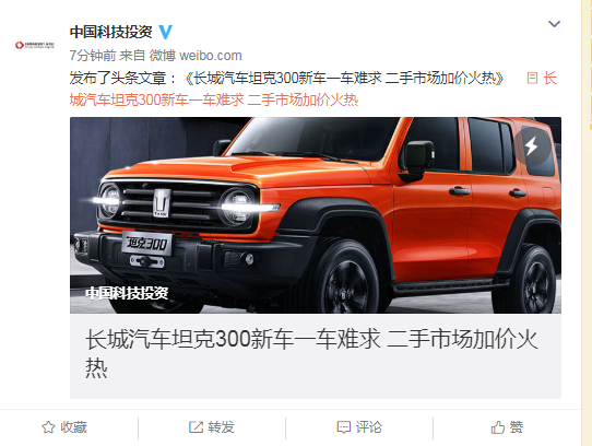 长城汽车坦克300新车一车难求 二手市场加价火热