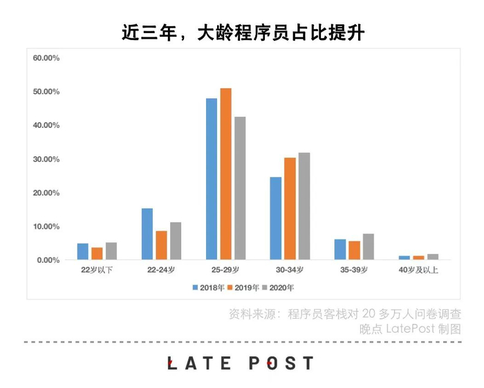 根据程序员自由工作平台 “程序员客栈” 的问卷统计数据,2020 年,30-34 岁的程序员在从业者中占比三成。