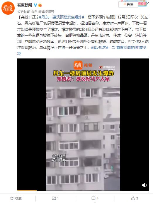 12月3日早6:30左右,丹东纤维厂15层楼顶层发生爆炸。据知情者称,事发时一声巨响,下楼一看才知道是顶楼发生了爆炸。爆炸楼层的部分阳台还有玻璃都被炸下来了,楼下停放的一些车辆也被掉下砖头、窗框等物品砸。丹东市应急、住建、公安、消防等部门立即启动应急预案,迅速组织展开现场处置和救援,疏散群众,将受伤2人送往医院救治,具体情况正在进一步调查之中。