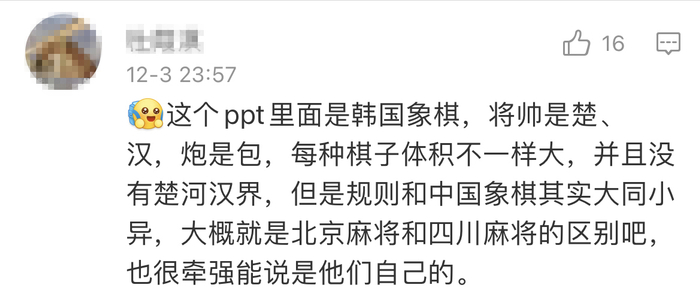 再说说象棋,有人提出,虽然韩剧中的PPT只写了“象棋”两个字,但图片中棋子大小不一,且没有楚河汉界,棋子中楚和汉最大,开局时,楚和汉放在九宫中心而不是九宫底,应该是“朝鲜象棋”(又名韩国象棋),也能勉强说是他们的。