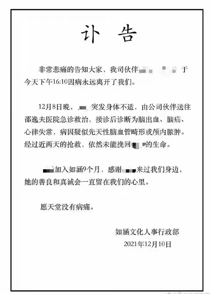 网友晒出的图片显示,如涵文化人事行政部发布讣告称,公司一员工于12月8日晚突发身体不适,由公司伙伴送往邵逸夫医院急诊救治,接诊后诊断为脑出血、脑疝、心律失常,病因疑似先天性脑血管畸形或颅内脓肿。经过近两天的抢救,依然未能挽回员工生命,于12月10日下午16:10去世。