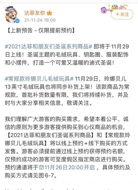 刚过来一天,11月25日,上海迪士尼第一次宣布推迟线下购买的时间,因配合上海的防疫防控工作原因,原定11月26日晚上20点开启的线上预约,以及11月29日线下销售的产品延期。