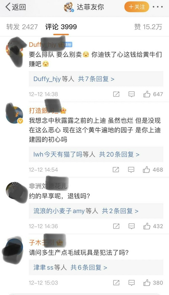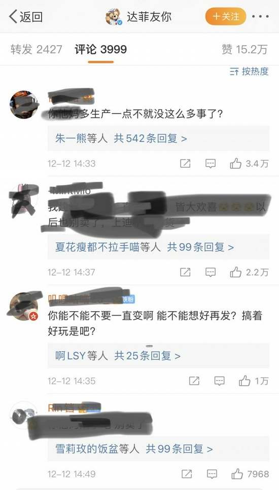 正所谓“人红是非多”,连续两次推迟发售新品时间,以及对销售政策进行调整,截至记者发稿时,迪士尼官方微博“达菲友你”下已经有3999条留言,网友们吵翻了。