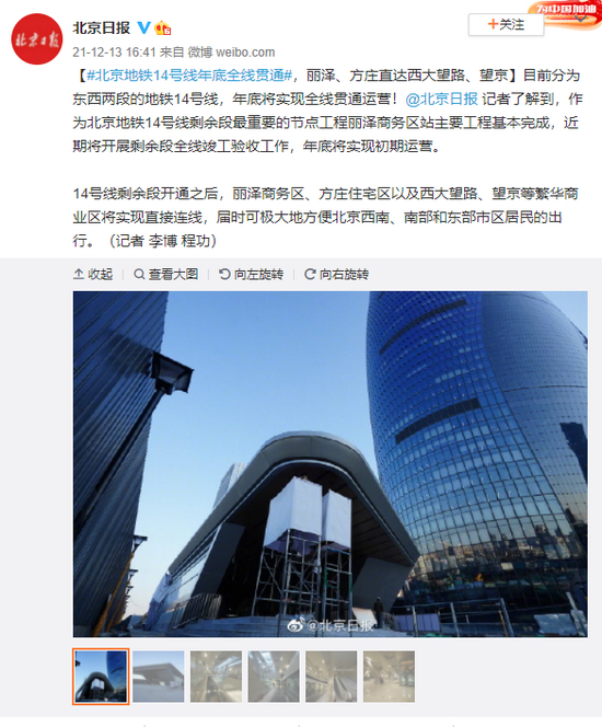 目前分为东西两段的地铁14号线,年底将实现全线贯通运营!@北京日报 记者了解到,作为北京地铁14号线剩余段最重要的节点工程丽泽商务区站主要工程基本完成,近期将开展剩余段全线竣工验收工作,年底将实现初期运营。