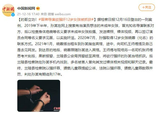 据检察日报12月16日登出的一则案例,2019年下半年,孙某在网上搜索有当演员想法的未成年女孩,冒充知名导演联系对方,后以检查身体疤痕等名义要求未成年女孩拍摄、发送裸照、裸体视频,再以签订演员合同等名义要求见面,以实施奸淫。2020年7月,孙强取得12岁女孩晓蓉(化名)的联系方式。2021年1月,晓蓉搭出租车到孙某指定宾馆,途中,向司机王师傅提及自己是去见网友。到达目的地后,晓蓉跟随孙某进入宾馆。王师傅与现场另一名司机张师傅思考片刻后,果断报警,兰陵县公安局民警赶至宾馆,将欲行强奸的孙某当场抓获。后兰陵县检察院在孙某手机内找到,多名被害人曾向其发过裸体相关视频和聊天记录。最终,兰陵县检察院以强奸罪、猥亵儿童罪提起公诉,法院以强奸罪、猥亵儿童罪数罪并罚,判处孙某有期徒刑17年。