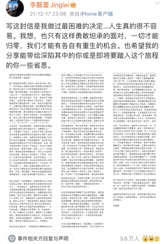 12月17日,王力宏前妻李靓蕾发文称,长期被王力宏及其家人羞辱和冷暴力,同时还曝出王力宏婚内出轨、私生活混乱等不为人知的事件。
