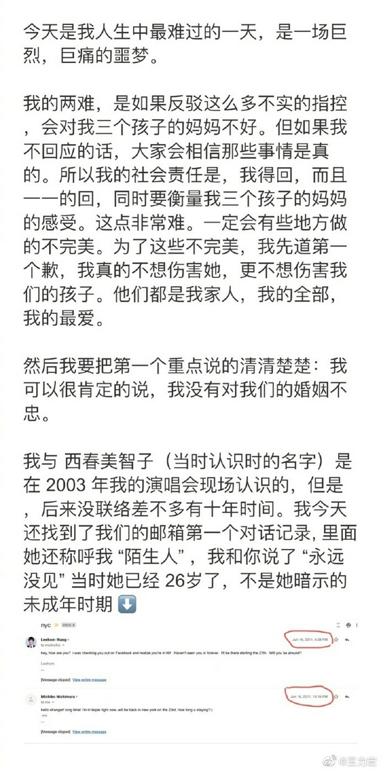 原标题:王力宏发文回应前妻指控:我没有对我们的婚姻不忠