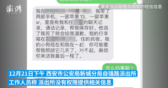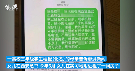 近日,陕西西安。大三学生程橙(化名)的母亲告诉澎湃新闻,女儿多次讨要租房押金未果,12月12日,在出租屋喝农药身亡,此前诊断出双向障碍。其母称,事发后,房东仍发送短信给程橙。