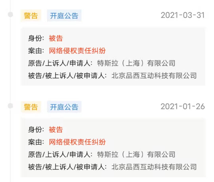 在特斯拉发起正式起诉后,品玩于2021年1月17日上午在其官方微博发布《关于品玩应诉特斯拉的情况说明》,表示将积极准备应诉材料,同时开始反诉特斯拉(上海)有限公司通过网络侵犯了品玩名誉权。