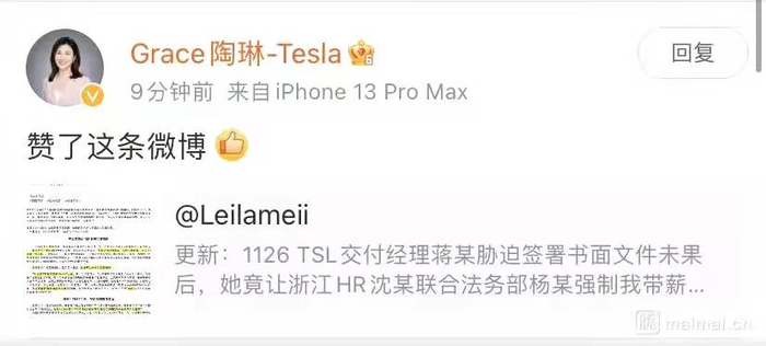 蒋某美在21日发布于脉脉的文章中表示,她就此事发布的微博曾得到特斯拉对外事务副总裁陶琳的关注。蒋某美14日通过公司内部邮件,致信yijian@tesla.com求助,申明她的诉求只是“恢复自己的名誉和岗位,并且对上述行为进行跨区域HR独立调查。”
