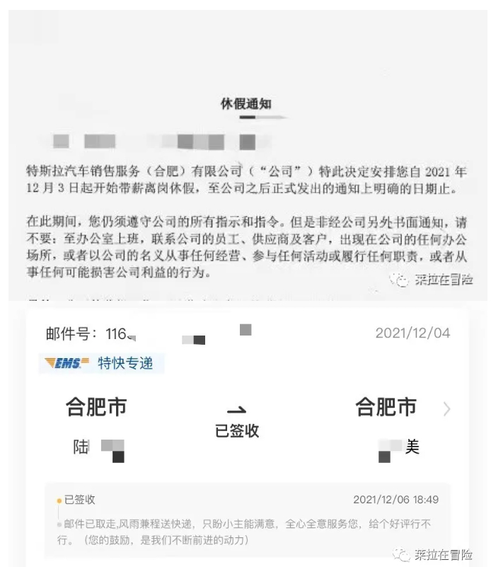 12月4日,蒋某美收到书面《休假通知》,系其直属领导陆某盖章邮寄。《休假通知》显示,特斯拉决定安排蒋某美自12月3日期开始带薪离岗休假,至公司之后正式发出的通知上明确的日期止。同时,特斯拉还在《休假通知》上要求,蒋某美在休假期间不能到办公室上班,不能联系公司员工、供应商和客户,也不能出现在公司的任何办公场所等。