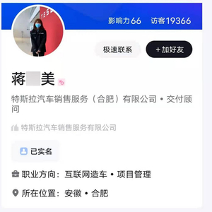 蒋某美在职场社交平台脉脉上进行了实名认证。她的职业信息标注为:“特斯拉汽车销售服务(合肥)有限公司交付顾问”。在微信公众号“莱拉在冒险”上,她也发文对整件事进行了详细的讲述,并出具了图片和录音等资料。