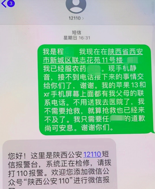 同日下午4:31,小程给陕西公安12110短信报警台发了一条短信,“我现在在陕西省西安市新城区联志花苑11号楼出租屋里,我已经服农药了,现手机静音接不到电话,接下来的事情交给你们了,谢谢。我的苹果13和 XR手机屏幕上面都有我父母的联系电话,不用送我去医院,我不需要抢救,就算抢救也已来不及了,我只需要房东任某的道歉尚可安息。谢谢你们。”