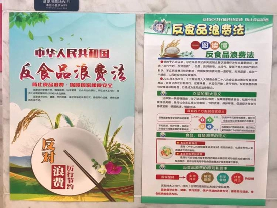 在记者走访的四家自助餐厅中,该店是唯一一家将《反食品浪费法》相关宣传张贴于店内的。宣传页分左右两张,左边为海报,右边则为具体解读,包括立法意义、食品浪费的定义等。