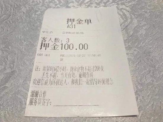 在押金单上,也写有相应的注意事项:用餐时间2小时,剩余食物不超过200克等。