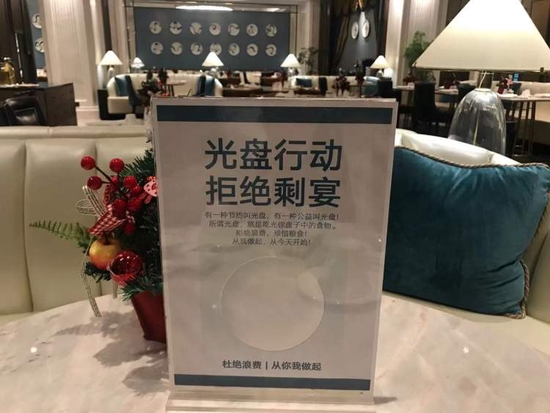 此前在光盘行动的倡导中,餐厅也积极响应,制作了一批“光盘行动拒绝盛宴”的立牌。“最近年末换了一批活动立牌,但活动结束后还是会使用这些提倡杜绝浪费的立牌。”