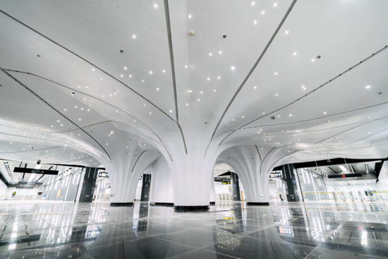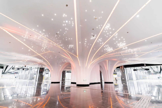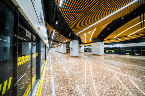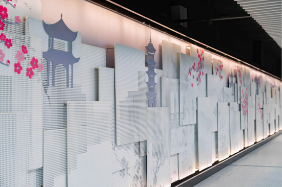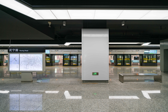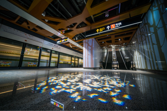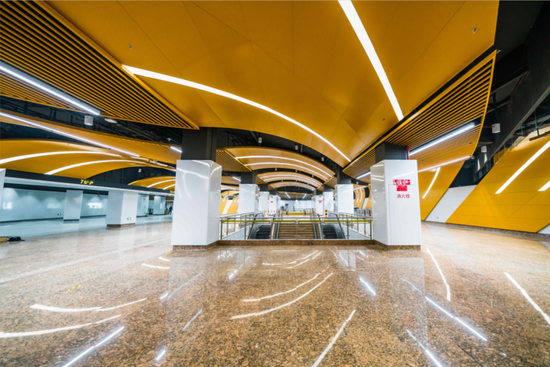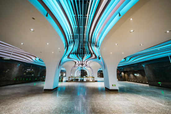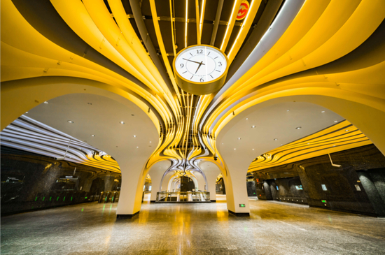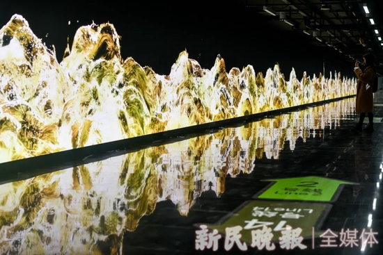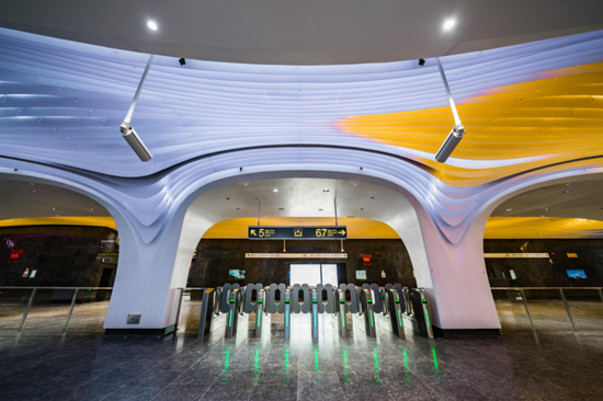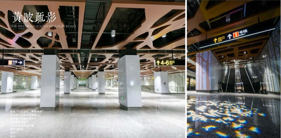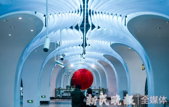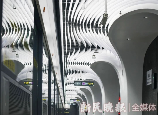 新民晚报记者在豫园站看到,整体的艺术风格极具未来科技感。身处站厅和站台之中,天花板的曲线线条优美,像江水一样自然地拍打在柱体上,形成有韵律感的脉动。建筑师熊星告诉记者,这是从黄浦江的水流形态获得的灵感,借着城隍庙飞檐的轮廓倒影,豫园站被打造成一座浑然一体的创新站点。