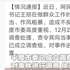 12月26日晚,山东平度市通过官方平台通报:近日,网民反映平度市云山镇党委书记王丽在做群众工作时,方法简单、言语失当、作风粗暴,造成不良影响。目前已对王丽作出停职调查处理,责令其向当事人赔礼道歉。平度市委已成立调查组,对事件进行调查,依法依规处置。